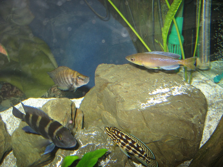Банка (переднє гнуте скло, Польща) 1,0*0,5*0,4 м, неони сині - 5, водорослеїд - 2, анциструс - 2, лабео - 1, даніо - 4, червоноголові тетри -6, боція 2 види по 1 шт. (знищили всіх катушок)!, вже є рамірезі - 6, Labidochromis caeruleus "Yellow" - 2 дорослих + 2 мальки :)