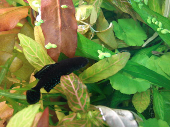 Лучшей фото сделать не получается , самец постоянно прячется в зарослях вместе с мальком моллинезии... ложится на листья - болен. Да и самочка чувствет себя не сучшим образом.