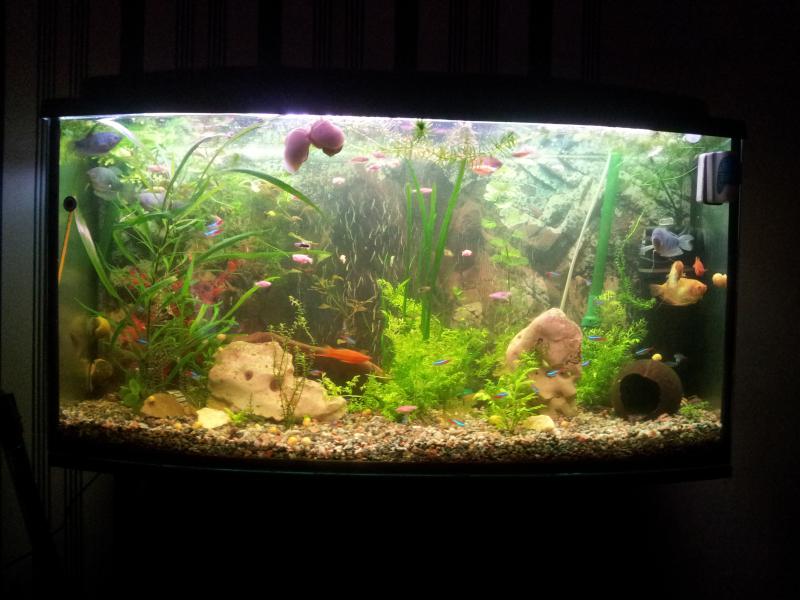 Рыбками никогда не болели и не пытались. И вот этим летом, случайно купили, сначала маленький Аквас на 83 литра полностью укомплектованный, а спустя месяц нам стало его мало и решили что то по более взять. И взяли красавца на 190 литров. Рыбок сейчас там: 30 неонов, 10 гуппий, 3 петушка, 2 меченосца, 2 скалярии, 8 гурами и 2 сомика. Не перебор ли??
