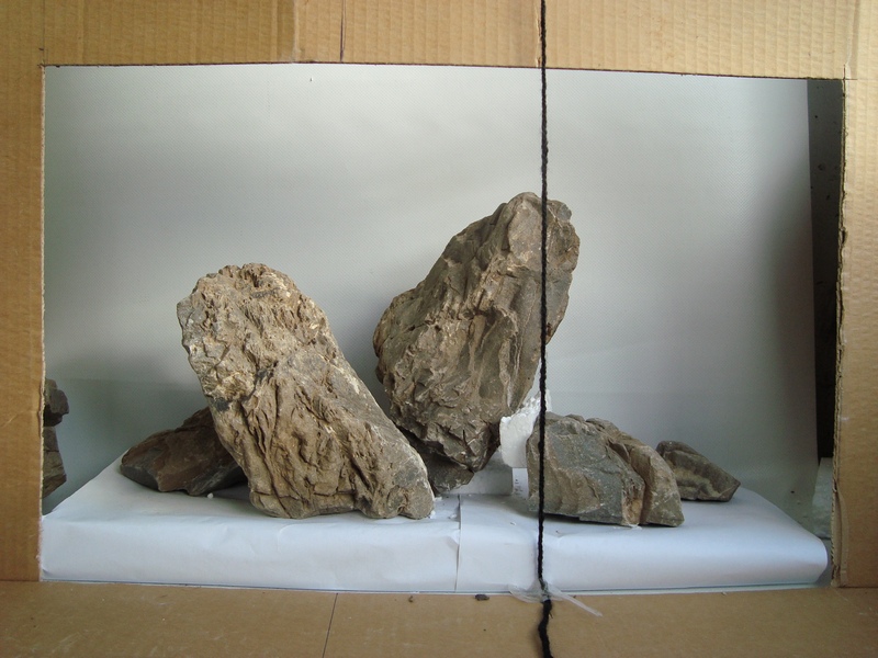 Перепад рельефа: переднее стекло - 3см и заднее - 12 см. В высшей точке аквариум узковат, пытался создать перспективу и глубину.