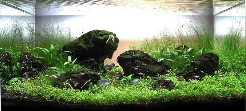 Вот отжил свое первый 180 л. аквариум, который я сделал специально для своего старшего брата и я решил сотворить что-то в стиле классического Ивагуми с медленными растениями, без длинностебельки. То, что из этого получилось, предлагаю Вам оценить.