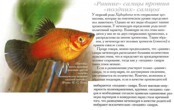 Все мальки , пород всех видов Xipxophorus меченосцев и пецилий , гуппи и т.д. рождаются и имеют внешний вид самок - ДО ПЕРИОДА СОЗРЕВАНИЯ . Анальные плавники у мальков и подростков имеют треугольную форму . Пецилии и гуппи имеют половые хромосомы , поэтому период созревания , занимает по времени около двух месяцев и проходит примерно одновременно . У меченосцев нет половых хромасом в буквальном смысле слова , гены ответственные за пол у меченосцев находятся на аутосомомах . Поэтому созревание самцов растягивается до года . У меченосцев в звисимости от начала работы генов определяющих пол , бывают ранние и поздние самцы . Это не перерождение самок в самцов , просто все самцы в размере до 2,5 см имеют внешний вид самок и в период созревания , развивается гоноподий , внутринние мышцы управляющие эрекцией гоноподия , отрастает меч . Начинающие любители приобретают поздних самцов , как самок . Внешне позднего самца от самки отличить сложно . Потом появляются небылицы о превращении самок в самцов . На фото 2 , самцы однопометники - крупный , поздний самец начал определяться после 10 месяцев , я оставлял его себе как самку ... P . S . Иногда у рожавших самок , анальный плавник становится похожим на гоноподий и отрастает небольшой меч . Эти самки спермы не производят . Такие самки появляются в следствии гормональных сбоев у самок меченосцев . Примерно как женщины транссексуалы принимают тестостерон . Иногда делаются херургические операции . Но даже после скальпеля херурга , женщины принявшие внешний вид мужчины , спермы не производят ... , как и переродившиеся под действием тестостерона самки меченосцев .