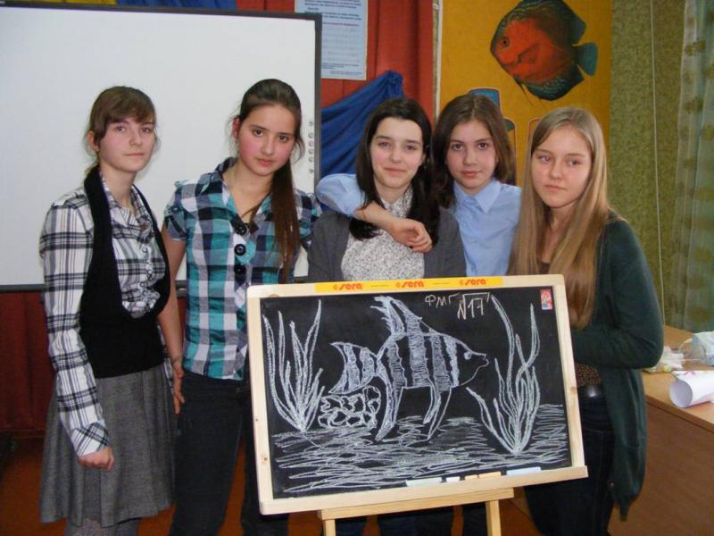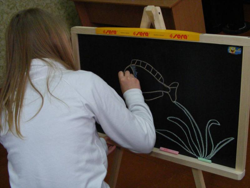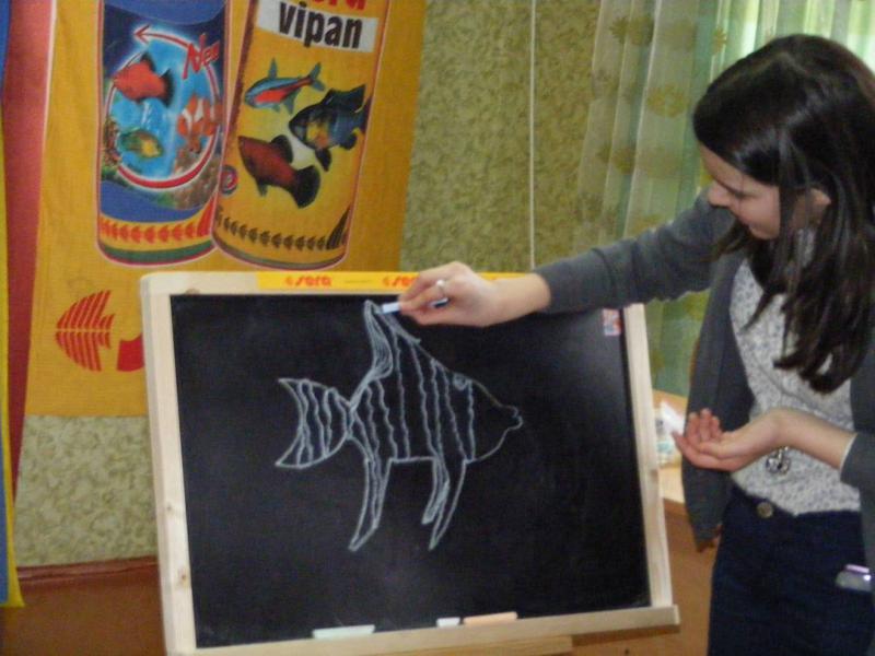 Кратко о самом конкурсе . Из групп поддержки , которые пришли поддержать свои команды-конкурсанты на крнкурсе по оформлению аквариумов , были путём опроса на аквариумную тематику отобраны команды по 5 человек с каждой стороны . Задача команд-нарисовать аквариумную рыбку . Условие-каждый участник может подойти к мольберту только один раз и рисовать до тех пор,пока не оторвёт руку от мольберта . Как только рука от мольберта оторвана , его сменяет другой участник команды и продолжает неотрывая руки рисовать . И таким образом до последнего участника .