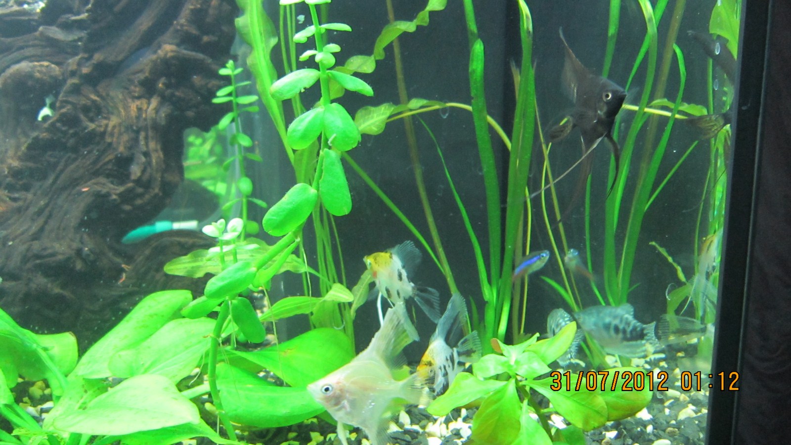 К концу недели после запуска были докуплены 2 скалярии, пять неонов (уже знаю, что скорее всего первые сожрут вторых), и две каких-то красненьких (до сих пор не могу понять кто это), плюс растючки какой-то. На следующий день обнаружил труп самки гупика(грешу на боциков). Так всё это семейство благополучно прожило ещё неделю.