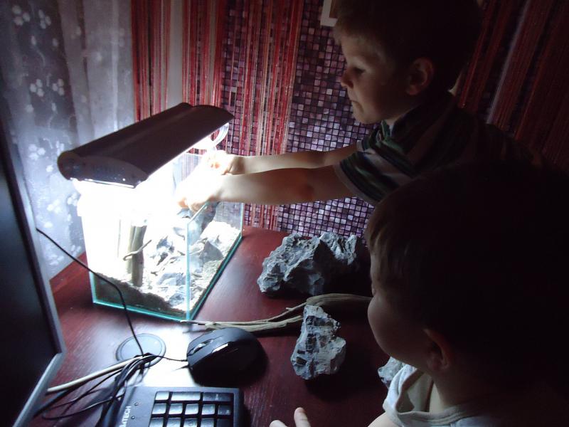 Ребята давно на мои аквариумы глаз положили, но сами пока ничего не делали. Кроме конечно самых элементарных вещей, таких как кормление обитателей, внесение папиного УДО, и конечно поддержка и подача оборудования при фотографировании и стрижках.