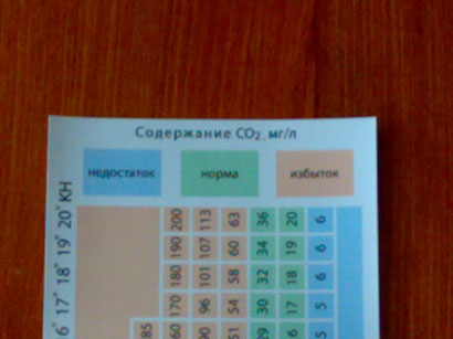 Все по той же таблице определяем концентрацию СО2 в аквариуме. Таблица тоже проста в использовании. Получаем результат: получаем значение 4, что маловато, для аквариума в который подается СО2. Тем более, что тесты деланы утром до включения света. И это подозрительно. Вывод: