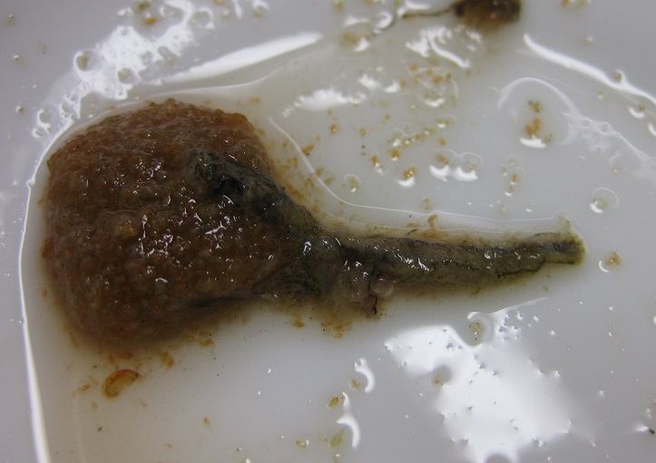 В планктоне оказалась подраскуроченая рыба длиной до 5 см. Ранее было что-то типа зеленоватых соплей, предположила, что водоросли и не особо разглядывая выкинула. А теперь вот думаю, что может также была рыбешка, но более подразложившаяся.