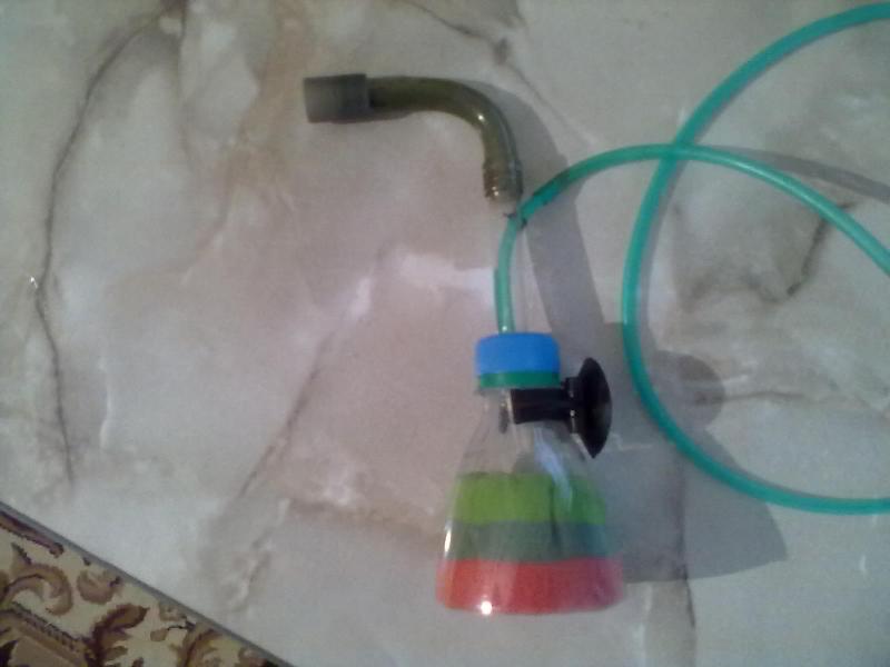 Согласен поролон сильно плотный,так-как под рукой ничего лучше не попалось пришлось поставить такой,потом заменю на крупнопористый.Были внесены изменения в процессе тестирования:удлинил шланг(столб воды стал выше и напор стал лучше):поставил распылитель:подачу воздуха на распылитель пустил через горлышко бутылки(стало больше места в основной трубке для забора воды).На фотке видно что губка снизу грязная(извиняюсь еще раз качество фото)и поэтому следует делать вывод что вода проходит через губку и осуществляет мех очистку.я думаю для аквариума 35л этого вполне хватит.Можете посмотреть на фото,губка до использования и через 9 дней она потемнела от грязи.