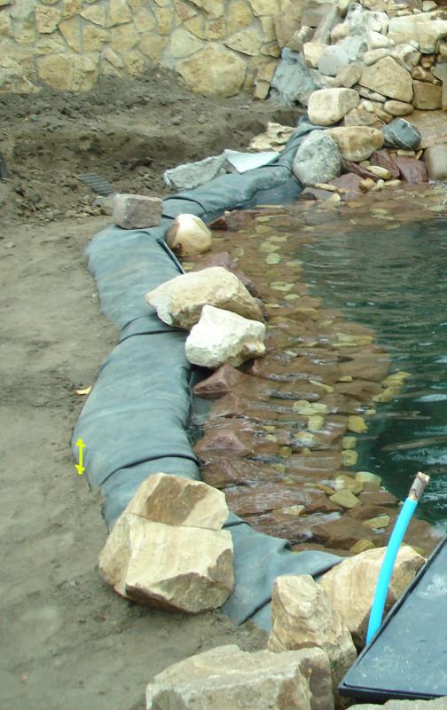 Для начала откопайте края пленки и подсыпьте грунт под нее к краю чаши, поднимите береговую линию. Это первое что нужно для дальнейших работ.