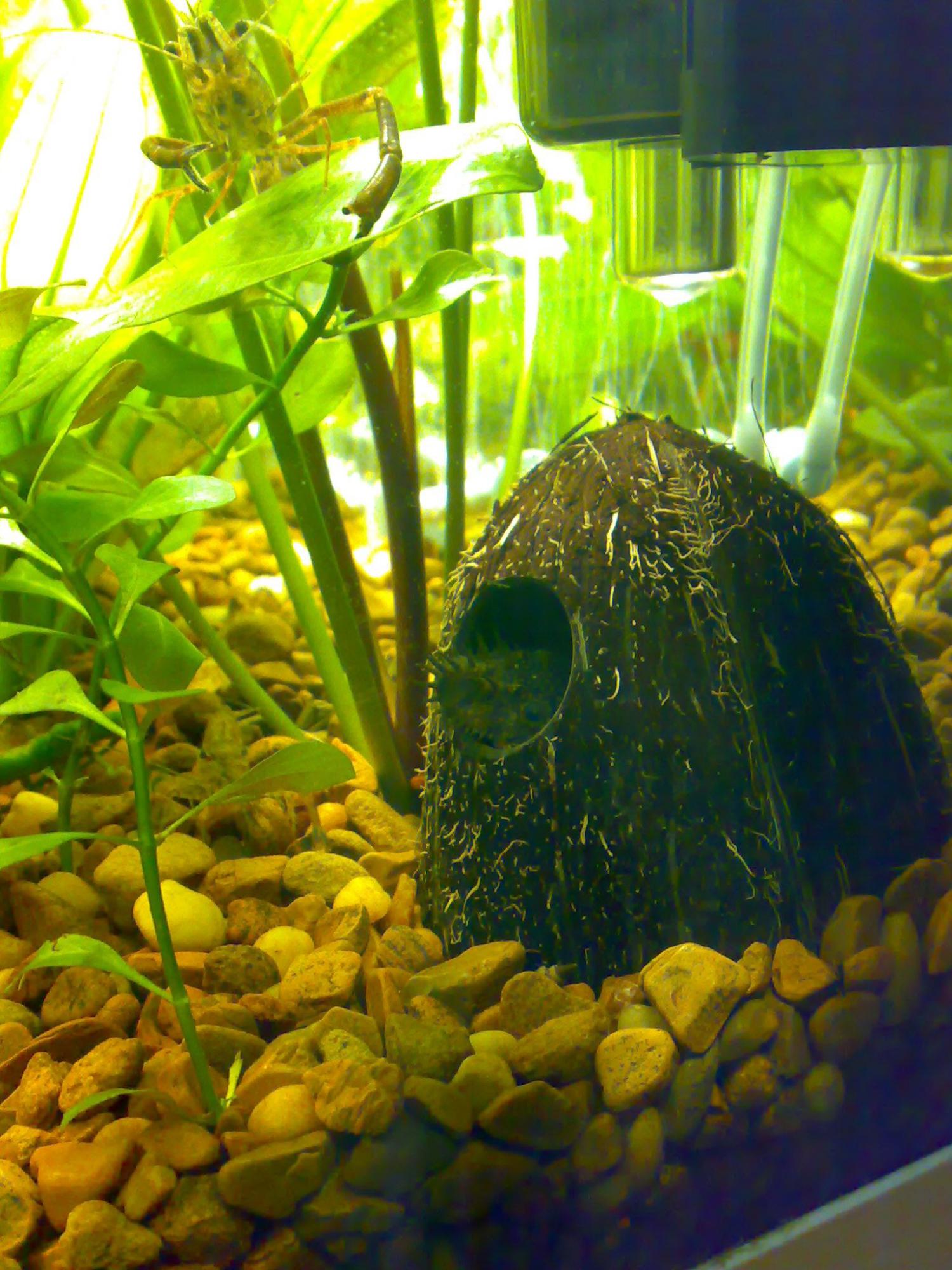 Разрезал ножовкой, выковырял мякоть, сделал "вход", промыл в воде и сразу в акву.