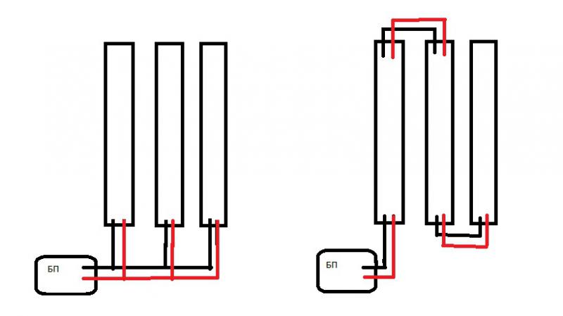делаю светодиодную подсветку на 25 литров. Возник вопрос: как правильно подключить ленты к блоку питания?