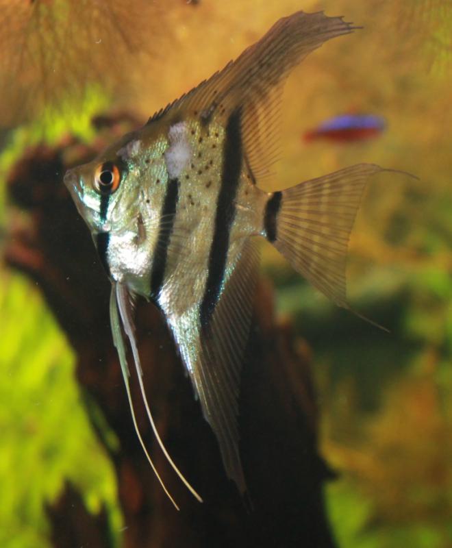 Помогите определить что с Альтумом? Отсутствие чешуи - то ли подрался? То ли стрессует, заселил 3 недели назад. Или заболел? что за болезнь? как лечить? Аква 300 л, запущен 5 мес назад, ph 7.5, dh 10, KH 5 , нитрат 10, Т=26, растений не мало. Подмены 1,5 в неделю. Фильтр 1500л/ч. Родостомусы 20, красные неоны 20, крапчатые сомики 10, альтумы 5.