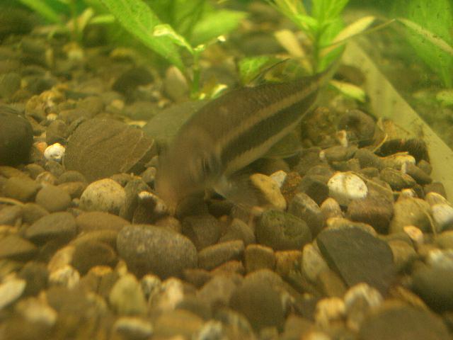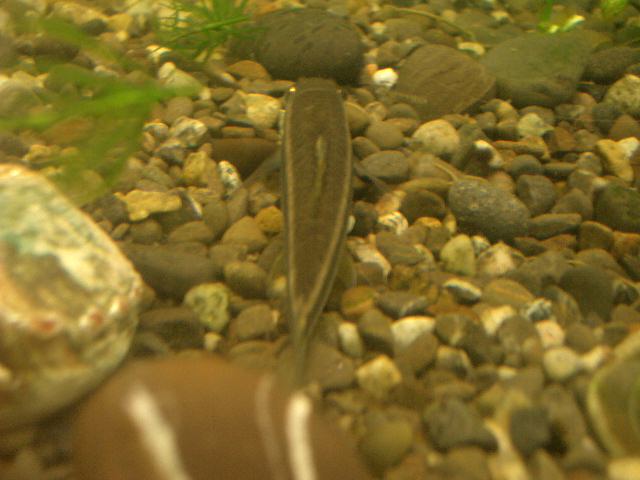 Губы по бокам красноватые но только одна пара усиков,рот не большой присоской а ротиком(как рот сомика перевертыша но немного уже),поперечная полоска доходит до самого начала хвоста,плавнички желтоватые,у основания грудных плавников маленькое ярко фиолетовое пятно(на обох плавниках),ноздри в виде выступов,довольно гибкая голова.