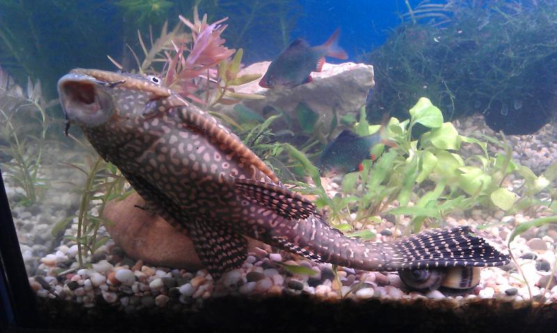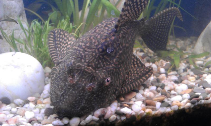 Питание: двухразовое, предпочитает таблетки со спирулиной для сомиков, мотыль, одуванчик (в летний период), на сухой корм особо не ведется, иногда пожевывает капусту и листья салата.