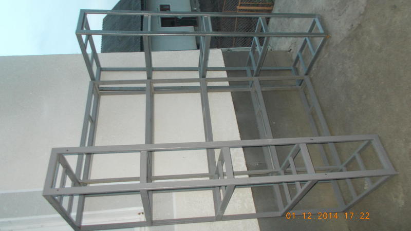 1. Набір який складається з трьох стойок з акваріумами.Розміщення стойок можна комбінувати.Розмір 253см довжини(всі три в ряд),220см висота,і 31глубини. Окремо розміри середньої Стойка 220см висоти,103см ширини,21см глубини.Покрашена грунтовкую в сірий колір.З роблена з профілю 4*2см. Є регулюємі ножки. Стойка розрахована на 4 акваріума, які ідуть з нею в комплект. Акваріуми розміром 100см ширини,21см глубини, 30см висоти. Якщо грубо рахувати десь 60 літрів одна банка виходить.