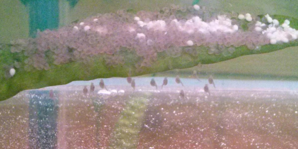 Через сутки, на вторые- в икринках зарождается жизнь ( фото). На третьи- появляются хвостики, а на четвёртые личинка начинает постепенно спрыгивать с конуса или листа.