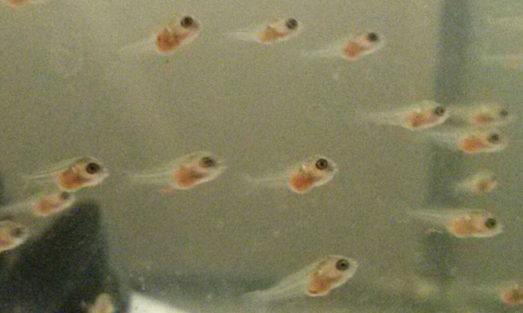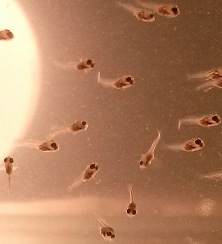 В течении первых суток малёк " расхаживается" и к концу дня- все плавают уверенно. Желточный мешок питает их первые сутки. На следующие- я начинаю кормить их науплией, которую ставлю заранее на инкубацию.