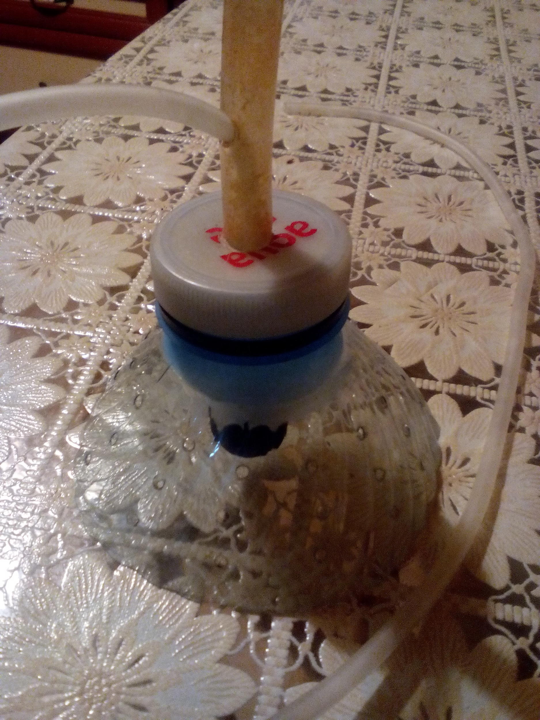 Маленький аэрлифт сделан из 1,5 л бутылки, только там не трубка вставлена в горловину, а пластик из под той же бутылки, скрученный в трубочку.