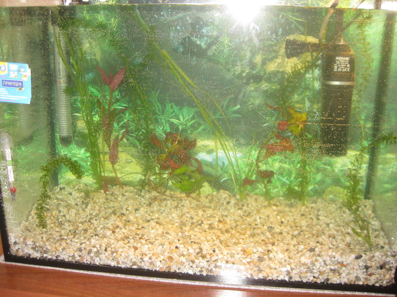 він дуже швидко росте, і забирає надлишок нітратів на старті, у Вас дуже мало рослин, можлива поява водорослей, рибку поки що не саджайте, по світлу можливі варіанти в інеті їх незлічити, я просто мала таку лампу от і використала. А запускала аквасик на зберігайці 4100, водоростей не було, але от рослин було багато.