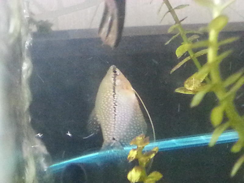 Жемчужный гурами начал висеть в углу аквариума, а потом я заметила темное пятно в жабрах, сейчас рыба находится у поверхности воды, у нее воспалены жабры. Неделю назад так же умерла моллинезия баллон.Тесты проводила, все в норме.Единственное, недавно резко температура в аквасе скакнула, может в этом причина?