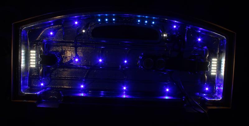 На второй фото лучше видно, что светодиоды все таки не обычные голубые и не малой мощности - можно сравнить с обычными 2-мя пластинами с синими диодами под отверстием в крышке, да и свет совсем другой.