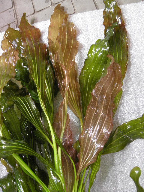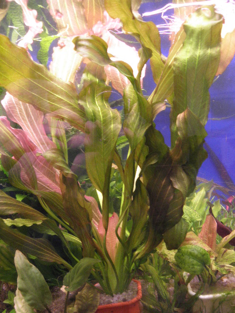 Echinodorus ‘Simply Red’ (Dschungelstar Nr 15) вырос у меня до 50 см в маленьком горшке с питательным грунтом. Скорость роста- быстрая, не капризный. Узнаваем. Еще очень редкий на Украине. Еще не размножался. Думаю стрелкуется без проблемм. Говорят что он обычно 30 см растет. Наверное я его перекормил. Еще у меня подача железа была малая, возможно добиться еще насыщенного цвета добавлением железа.