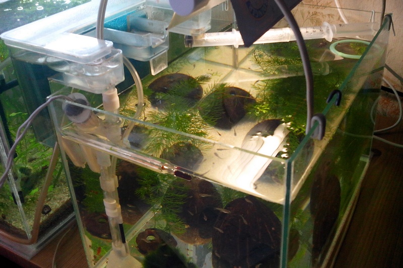 В отсаднике на 10 литров примерно 100 мальков гуппи 2 молодых коридораса и до 10 простых креветок.