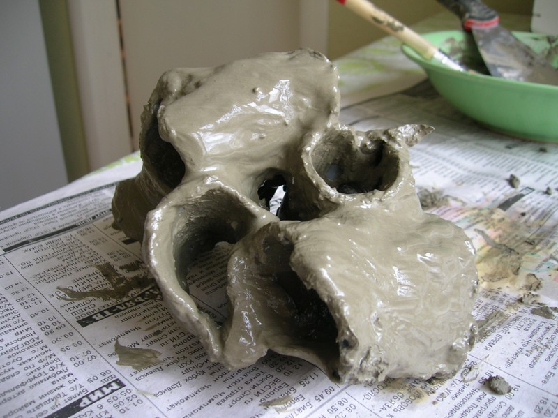 Доделываю дом для цихлид хочется чтобы выглядело как можно более натурально что посоветуете Уважаемые форумчане?Если не красить добавить на время света в аквариуме чтобы обросло зеленью как будет? Лучше или все же красить?По словам Fly идея заслуживат внимания(Спасибо Fly -приятно) поэтому решил на остатках труб показать подробно изготовление подобной декорации. Сначала нарезаем канализационную трубу кусками как рука ляжет(у меня легла вот так куски около8-10 см)  затем начинаем спаивать эти куски простым паяльником  получилось вот так  теперь оплавляем это над огнем  Fly и egor высказали предположение что тонкий слой цемента может отвалиться для предотвращения этого делаем паяльником хаотично отверстия и всякие зазубрины  и обмазываем цементным раствоом в несколько слоев при помощи пальцев и кисточки  Для того чтобы раствор не растрескался при сушки накрываем полученную дкорацию пакетом и переодически спрыскиваем водой.Мое первое произведение сохло три дня и второй день отмокает в воде ничего не отваливается