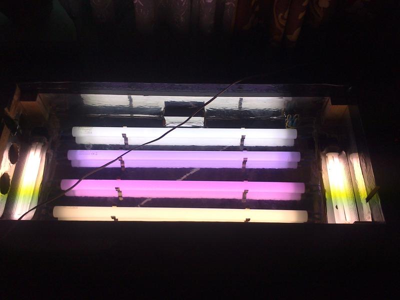 3) досвети углы короткими лампами, например экономками, 11Вт PLC, 18Вт PLL или новомодными сейчас светодиодами (например по 3шт красных 660нм и один синий425нм 3Вт) Просто белые любой цветности для травы бесполезны, но в качестве света норм.