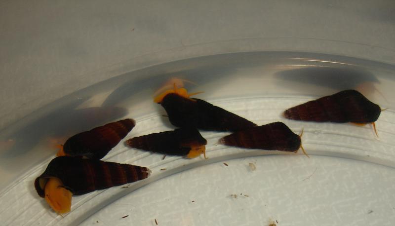 улитки своего разведения (!), а значит адаптированы к нашим условиям. Живородящие, поедают водоросли (для молодняка являются практически основным источником питания, более взрослые начинают подкармливаться дендритом и кормом для рыб). У меня живут с тиломеланиями, а также в аквариуме для золотых рыбок, где стенки обрастают зелёными водорослями. Рождаются очень мелкими (1 мм), но в отличие от тиломеланий растут быстро (в полгода могут быть 4-5 см).