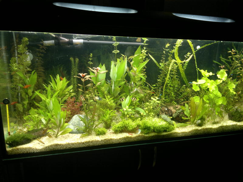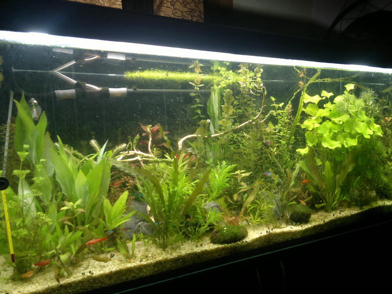 Созвонились, попросил совета по запуску и его УДО. Проблема состояла в том, что аквариум стоял в летнем домике и запуск был всего на месяц - потом аквариум нужно будет опорожнять и перевозить. Ну думаю как раз наберусь опыта за месяц) Заказал всяких растений, УДО у DEPSa, выкинул свой морской венигрет с пляжа( хочу заметить что вода у нас достаточная жесткая, артезианская pH-8, GH 13-14, KH 10-11) Купил кварцит 3-5мм, переделал крышку сделав примерно 1Вт/л, СО2, внешник RESUN и ЗАПУСТИЛСЯ) Причём в силу отсутствия терпения запускался быстро. На второй день были посажены растения, на третий день уже заселен барбусами, неонами и маленькими сомиками))) Само собой темпы роста у меня были далеки от того как перла растючка у Прохора, но я всё равно не мог нарадоваться своим аквасом. Долго не мог поймать соотношение нитрат фосфат. Нитрат был 10-15, а фосфата едва доходило до 0,5 и пока я не залил правильную дозу РО4 макро не лил, только микро чередуя с хеллатом Fе. К сожалению сам запуск я не додумался сфоткать. но гдето через дня три сделал несколько снимков