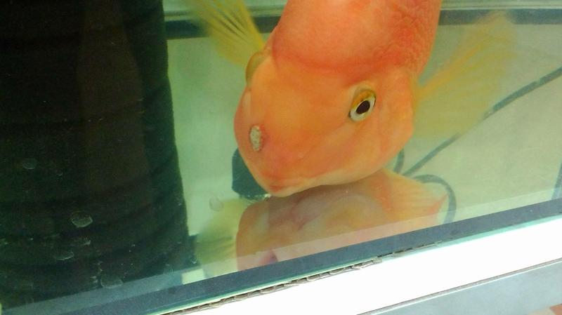 Аквариум 450 литров , подмена воды 1 раз в неделю 50 %, корм сухой. Еще есть аравана, ее замороженным кормом. На данный момент отсадил попугая в маленький аквариум и лечу препаратом tetra medical lifequard