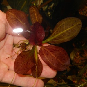 Вот как его описывает автор. Компактное растение с овальными листьями до 12 см в длину и до 8-ми в ширину. На вершине листа имеется выемка, а у основания могут быть ушки. Листья жесткие, глянцевые, с обеих сторон пятнистые. Верхняя часть листа в прохладной воде почти черного цвета (за что и получил свое название) с бурыми размазанными пятнами, листья как бы ломаные примерно пополам (одна половинка расположена под углом к другой). В теплой воде выглядит в бордово-фиолетово-красных тонах *с крапом. Никаких заморочек с ним не бывает, нетребователен к условиям. В силу того, что листья толстые, стабилен. Размножается и от корневища и цветоносами.