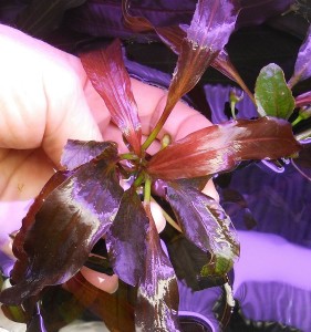 Вот краткое описание : довольно мощное растение, высотой 40 см., весьма многолиственное. Листья удлиненно-ланцетные, 4-6 молодых — малиновые,полупрозрачные, толстые по фактуре, гибкие, водой не смачиваются, слегка волнистые по краю. Черешки не длинные, зеленые. В содержании очень неприхотлив.