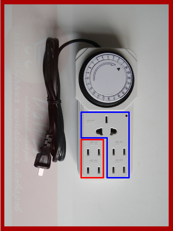 Механический таймер RS-03 прост в настройке - нажать нужные лепестки и всё. Но, этот таймер интересен большим количеством подключений - до 5-ти устройств. При этом следует учитывать, что розетки, обведённые на фото красным - работают постоянно, а обведённые синим - подключены через таймер: