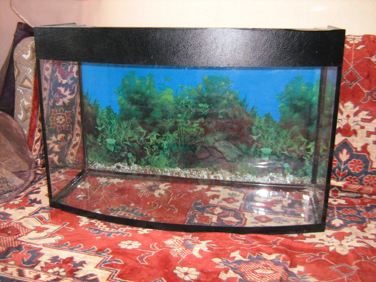Состояние хорошее - имеются небольшие царапаины, которые видны только в пустом аквариуме, при заполнении водой их не видно. Приклеен задний фон, который можно легко отклеить. если он не нужен.