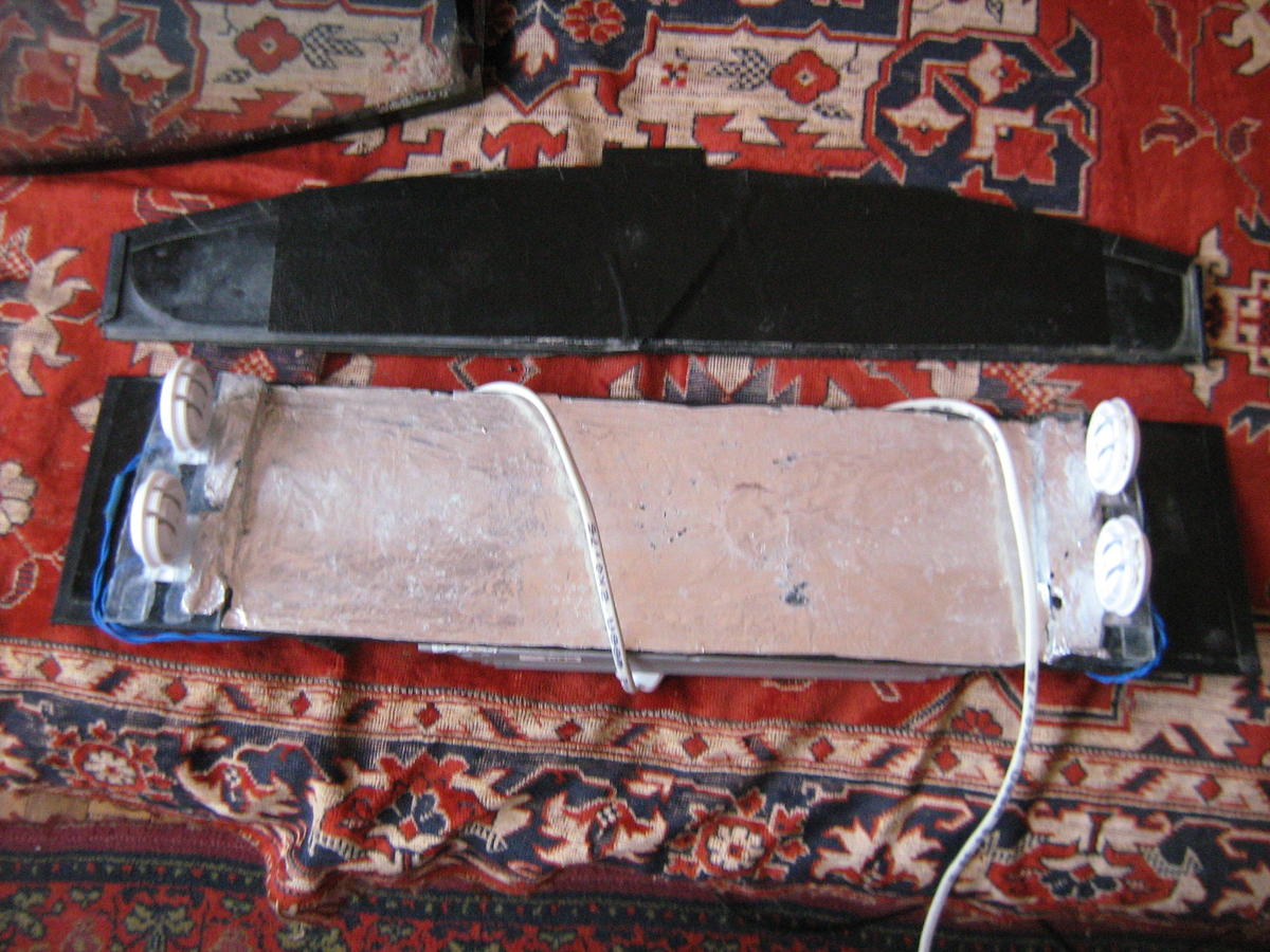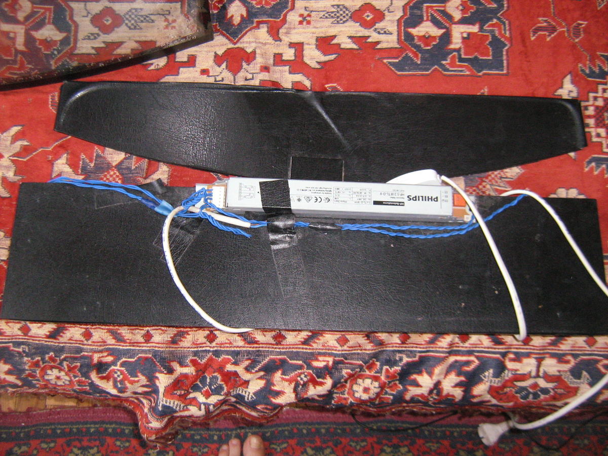 К аквариуму имеется покровное стекло, состоящее из двух половинок (оклеенное черным ораколом). К покровному стеклу "умелыми" ручками прикрепили патроны, и эпру на 2 лампы (2*15 Вт Т8). В один из дней эпра плюхнулась в воду и погибла.