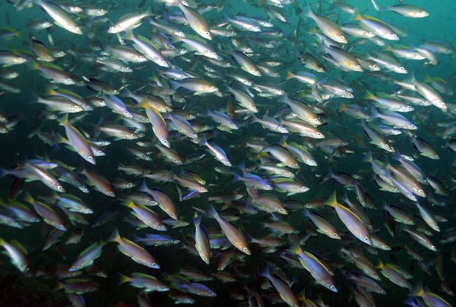 Рис. 7. Колония Cyprichromis leptosoma на 8-ми метровой глубине в Silaf Rocks, Cape Mpimbwe, Танзания. На фото видны цветовые вариации C. leptosoma с оранжево-синей хвостовой частью, а также с желто-синим спинным плавником. Колония объединяет все цветовые вариации, а так же бесцветных самок. Во многих областях вокруг Cape Mpimbwe, иследуемые крупные колонии C. leptosoma по предварительным оценкам насчитывали до 100,000 особей.