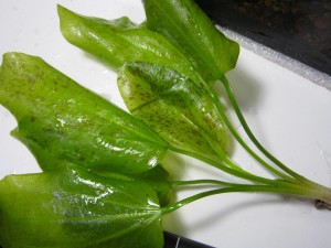 Эхинодорус «Леопард»*относиться к широколистным видам. Листовая пластинка сердцевидной формы с заостренным концом. Молодые листья красно-коричневые, густо усеянные темными пятнами. Благодаря этому растение и получило характерное название, которое сравнивает его с пятнистым животным. Старые листья становятся зелеными, но пятнистость сохраняется. Длина черешка не превышает длину листовой пластинки. В аквариуме, при благоприятных условиях, растение может вырастать до 50 см в высоту.