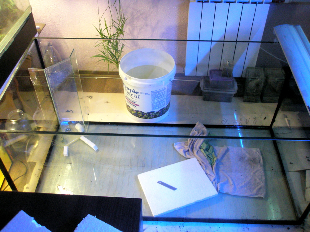 Старый аквариум был на 80% слит и понемногу вместе с тумбой и сампом передвинут под другую стену, животные не вынимались.