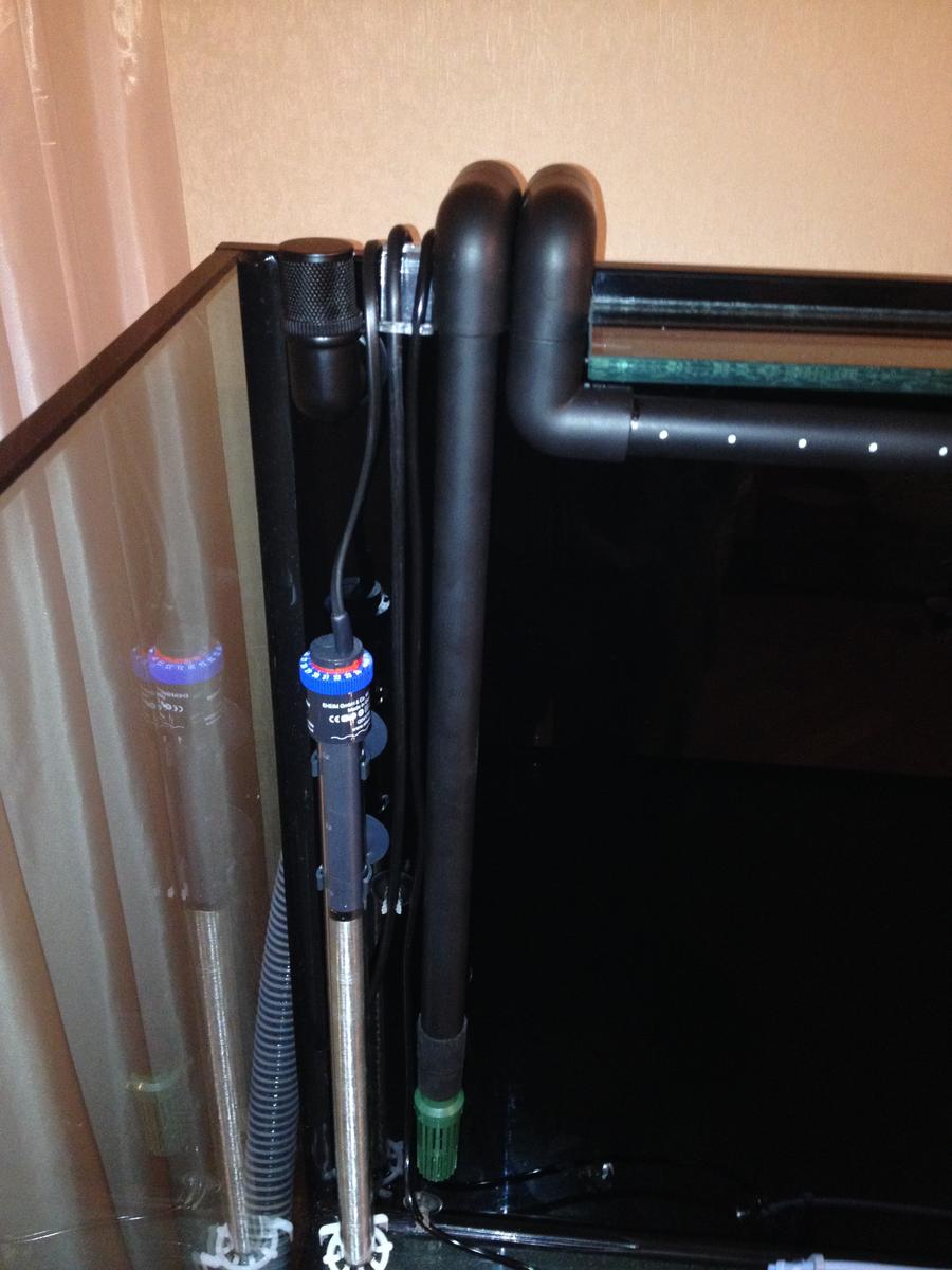 хронология чуть чуть хромает, но не думаю что это принципиально. Изначально фон был приклеен, но скорей всего из-за перепада температур при перевозке было куча пузырей. Старый фон был удален и куплен новый черный фон оракл, который я и приклеил. Мной было принято решение об установке двух фильтров. На форуме был приобретен fx6 практически в новом состоянии у "вадим с" за что ему огромное спасибо. и куплен эхейм 2080. При этом был приобретен стерилизатор Атман на 36 ватт и компрессор Schego M2K3 , распылитель Hagen Elite 119 см, два обогревателя Eheim Jager 300 Вт. Спустя кучу времени по мере сборки тумбы, и водружении аквариума сначала на 5 см пенопласт (утром был заменен на 1,5 см полипропилен) стал вопрос по поводу подключения всей выше перечисленной техники. Наверное это было самое интересное. Было понятно что разноцветные трубки это не то что хотелось бы увидеть и поэтому все все было собрано на трубах ПВХ с изготовлением флейты и т.д. Все было покрашено черной краской.