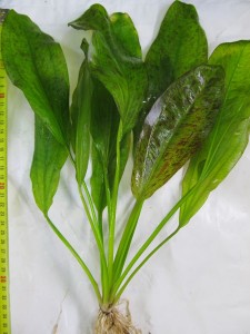 Echinodorus *‘Ozelot Gold’ — один из крупных представителей эхинодорусов. Растение не капризное, хорошо растет как в свежем, так и заиленном грунте. На ярком месте покажет золотистый до красноты окрас молодых листьев. Цвет может не пропадать практически у всего куста. *Высаживать можно и на заднем плане, и даже в затененных участках, сохраняя густую крапчатость. Растение сильное, подойдет и для начинающих садоводов). Размер лота выше 30 см, куст почти маточный.