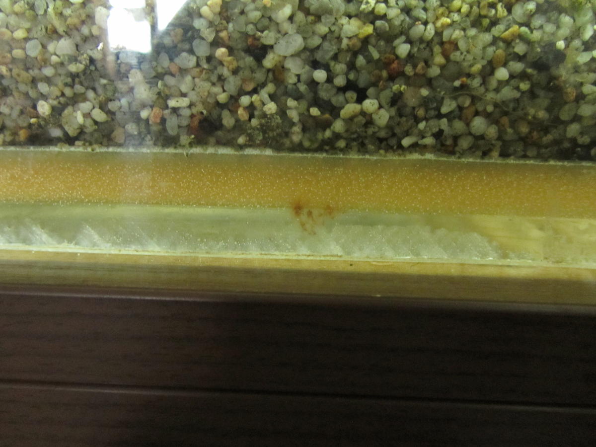 Здравствуйте! Под швами оргстеклянного аквариума местами посветлевшие участки. Есть пару таких, будто ржавчина. Скажите, пожалуйста, кто знает, что это такое, пора включать панику на полную мощность и сливать воду?