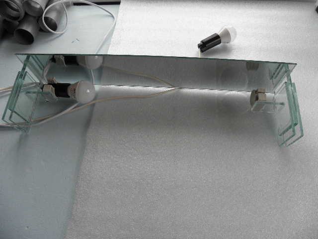 2 кусочка стекла 5 см на 3 см это пойдет чтобы закрепить держатель для патрона. Зеркало кусок 50 см на 10 см. Матовое или темное стекло 50 см на 6 см, чтобы заслонить лампы спереди. Силикон. Держатель для трубы 25-27 мм.- 2 шт. Патроны Е14, вилка, провод, лампочки. Особо рассказывать нечего- по фото все ясно. Все очень примитивно и просто. В основном тут небольшие кусочки стекла, которые стоят дешево в мастерских, так как это отходы производства. Понимаю, что тут особо нечем хвастатся, так как именно нужно было простое и дешевое решение и клею из стекла первый раз. Может кому и пригодится идея. Лампочки 6400 К для травника самое оно пойдет. Выходит 1200 люмен в сумме. 20 люмен на литр. Без СО 2 простым растениям самое оно. В отличие от закрытых крышек, тут нет угрозы для лампы со стороны перегрева и конденсата- все отлично естественно вентилируется, так что гарантией не прийдется воспользоватся, лампы будут работать долго. Подвинув светильник к заднему стеклу очень легко обслуживать аквариум, садить растения, при этом свет включен и не мешает светильник. Два бортика ножек делают светильник весьма устойчивым.