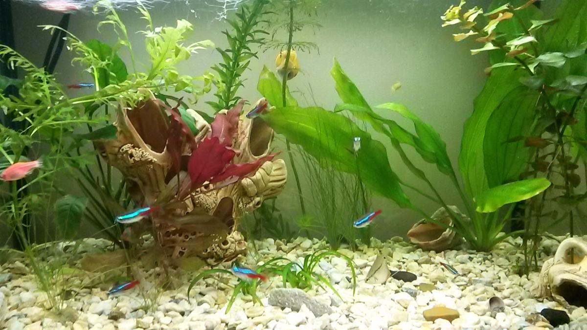 - Видовой и количественный состав населения - Неон - 9 шт, Золотая гурами - 1 шт, Жемчужная гурами - 2 шт, Данио розовый - 2 шт, Данио леопардовый - 3 шт, Анцитрус - 3 шт (один взрослый, 8 см), Ампулярии - 2 шт, Кольцерукие креветки - 3 шт. Все в среднем 3-4 см. Людвигия, сагиттария, элодея, анубиас, ситняг игольчатый