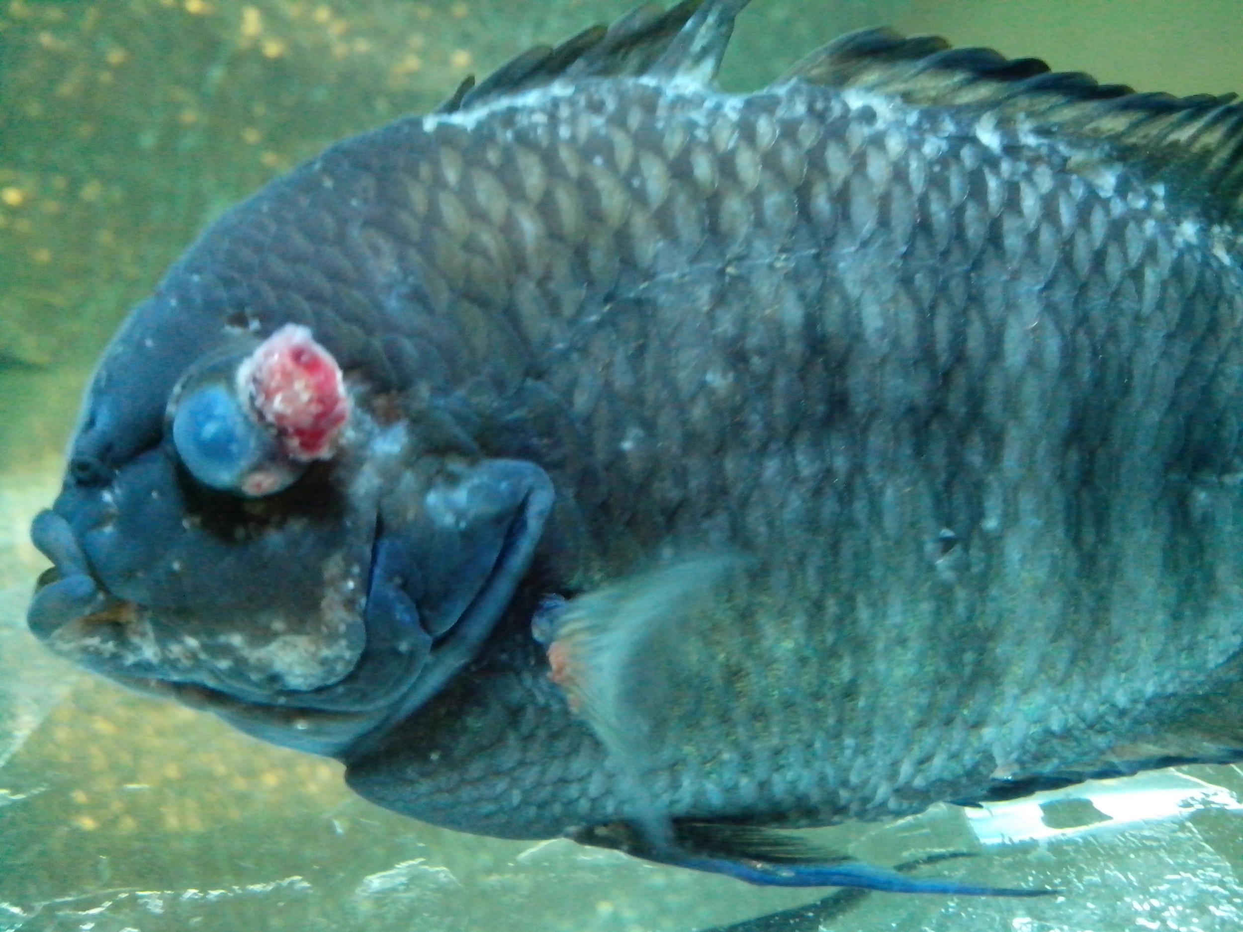 Седжик вначале выпучился глаз потом начала расти язва и чтото выпучилось глаз втал на место но глаз ослеп болеет в течении двух недель лечил ципрофлоксацином и нестатином первый курс неделя потом вьорой курс изониазидом выделений никаких нет кал нормальный но рыбка не ест сейчас плавает у поверхности перед этим была дырочная болезнь месяца два назад нелечил само все заросло а да еще у основания плавника брюшного с той стороны где язвенный глаз какието красные бугорки очень жду помощи в нете рыл такого не нашол