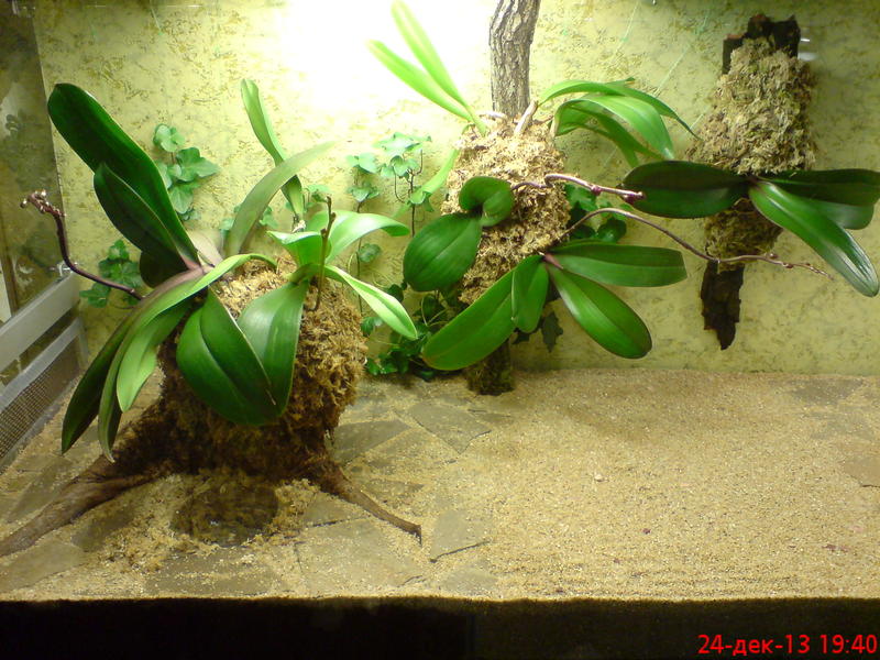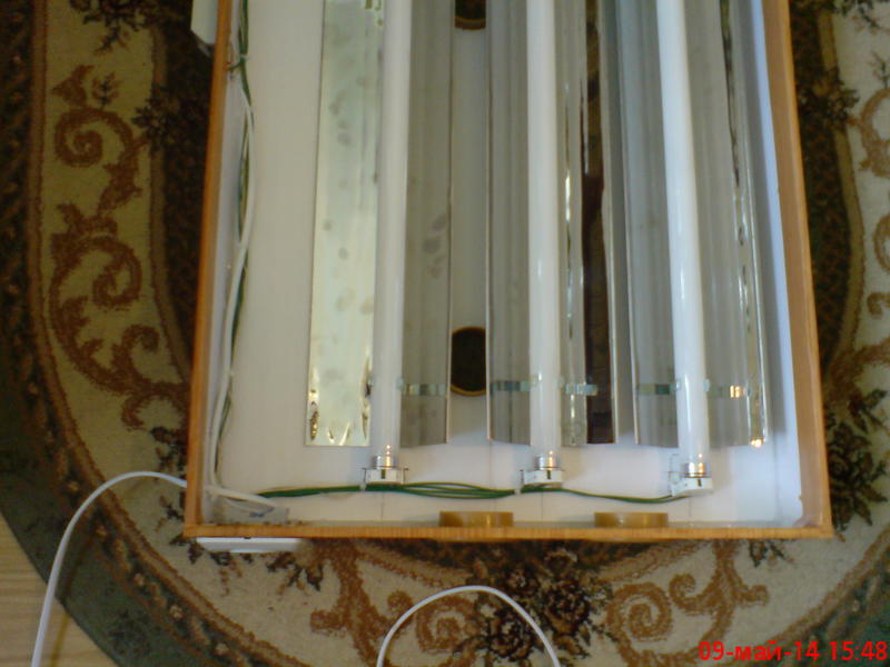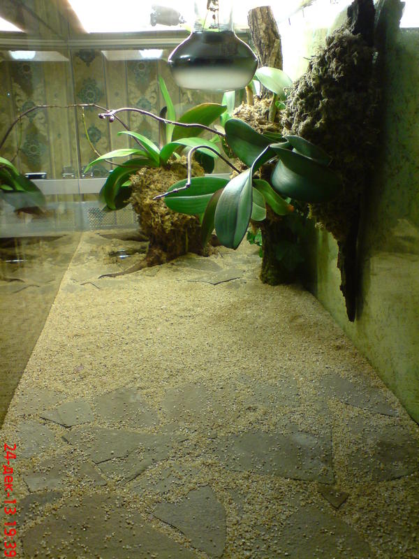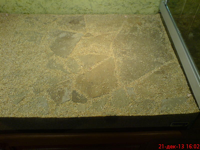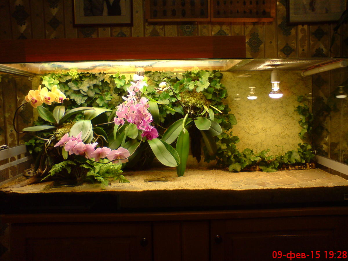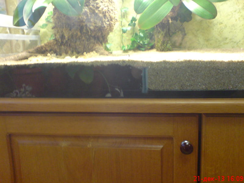 и так у аквариума были удалены ребра жесткости и боковые стекла. потом вклеено стекло 5 мм на бока для крепления дверок и на потолок для крепления сетки вентиляции. над дизайном еще работаю. и будет еще сделана крышка точнее короб для трех линейных ламп по 30 Вт для освещения . пока лежат три енергосберегалки по 32 Вт и что б не били в глаза закрыты чем было под руками. обогрев осуществляется лампой рефлекторной 60Вт и термокабелем 80Вт который подключен через димер для получения нужной температуры да и думаю ресурс его работы будет на много больше если он будет работать в 1/3 своей мощности. и еще уменьшить мощность и соответственно нагрев можно с помощью димера а увеличить если не хватит то проблематично только заменой кабеля на большую мощность. кабель проложен внутри террариума в песке и сверху покрыт плоскими камнями занимает 1/3 площади дна.