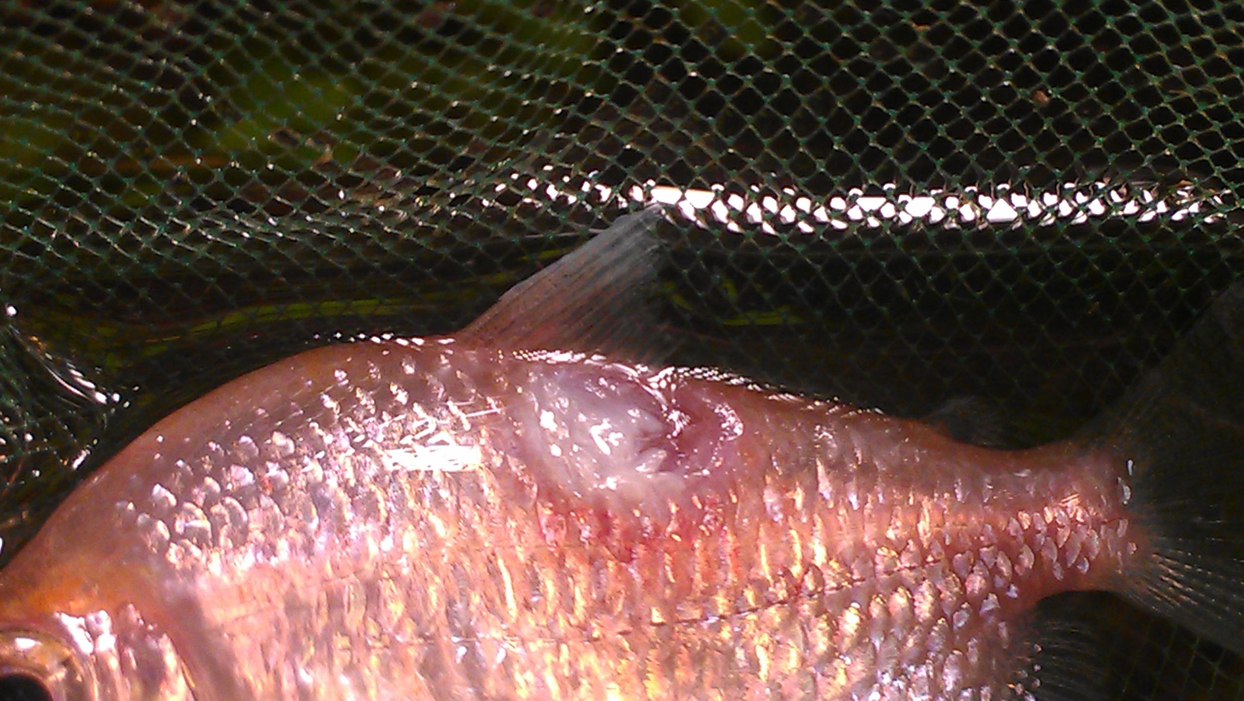 Рыба ведет себя вяло,отказывается кушать,прячется в зарослях растений, на боку в районе верхнего плавника появилась язва белого цвета.Утром заметили опухоль водянистую, похожую на ожог,,но рыба вела себя как обычно, а через пару часов на месте опухоли появилась язва.