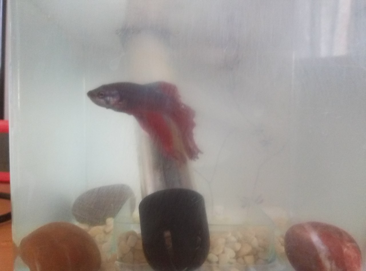 Мой первый опыт в аквариумистике. Старый аквариум у парня от прошлой рыбки. Все тщательно было вымыто, высушено, подготовлено к приезду рыбки. Сначала еще было пластиковое растение. Поэтому, когда месяц назад я заметила оборваненький хвост, я подумала, что из-за него и выкинула. Вроде бы, хвост стал отрастать. И вот недели полторы назад он стал опять вялым. Аппетит нормальный. Немного вздулось ближе к хвосту. Может, перекорм?