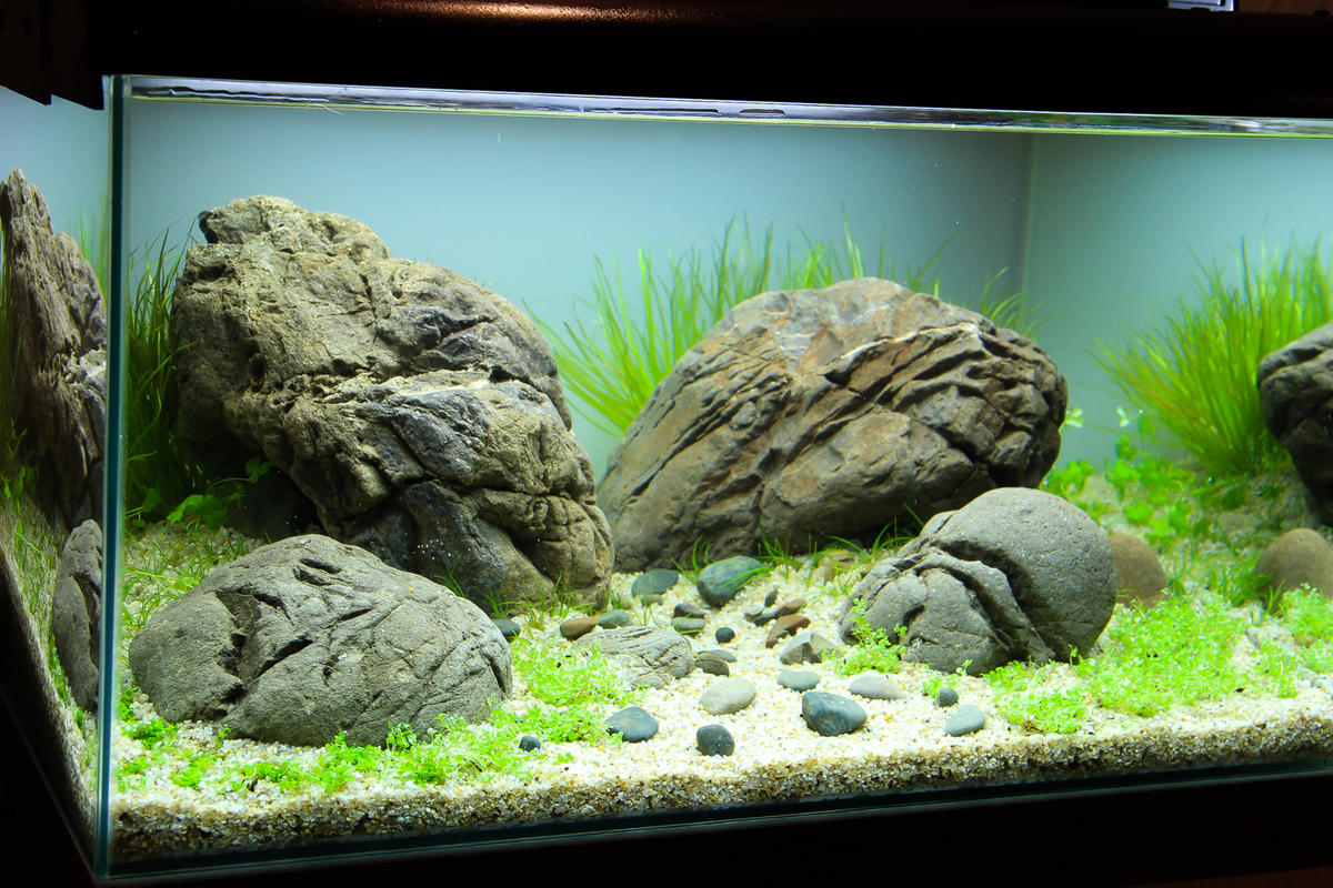 РАСТЕНИЯ. Подбирая растения под данный проэкт,решил не "выдумывать велосипед",а использовать почвопокровку на переднем плане,и по контуру камней.В качестве почвопокровки использовал Eleocharis sp mini и Hemianthus callitrichoides "Cuba". Ситняга было достаточно своего,а вот Куба не успела нарости,поэтому принял решение приобрести "сухарь" Кубы. Цвет и размер сухой формы Кубы немного разнится,но со временем надеюсь всё сравняется-перемешается.
